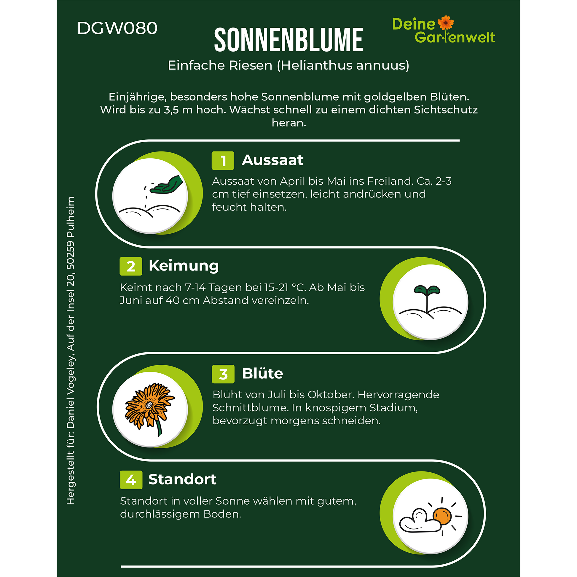 Einjährige, besonders hohe Sonneblume mit goldgelben Blüten. Wird bis zu 3,5 m hoch. Wächst schnell zu einem dichten Sichtschutz heran.