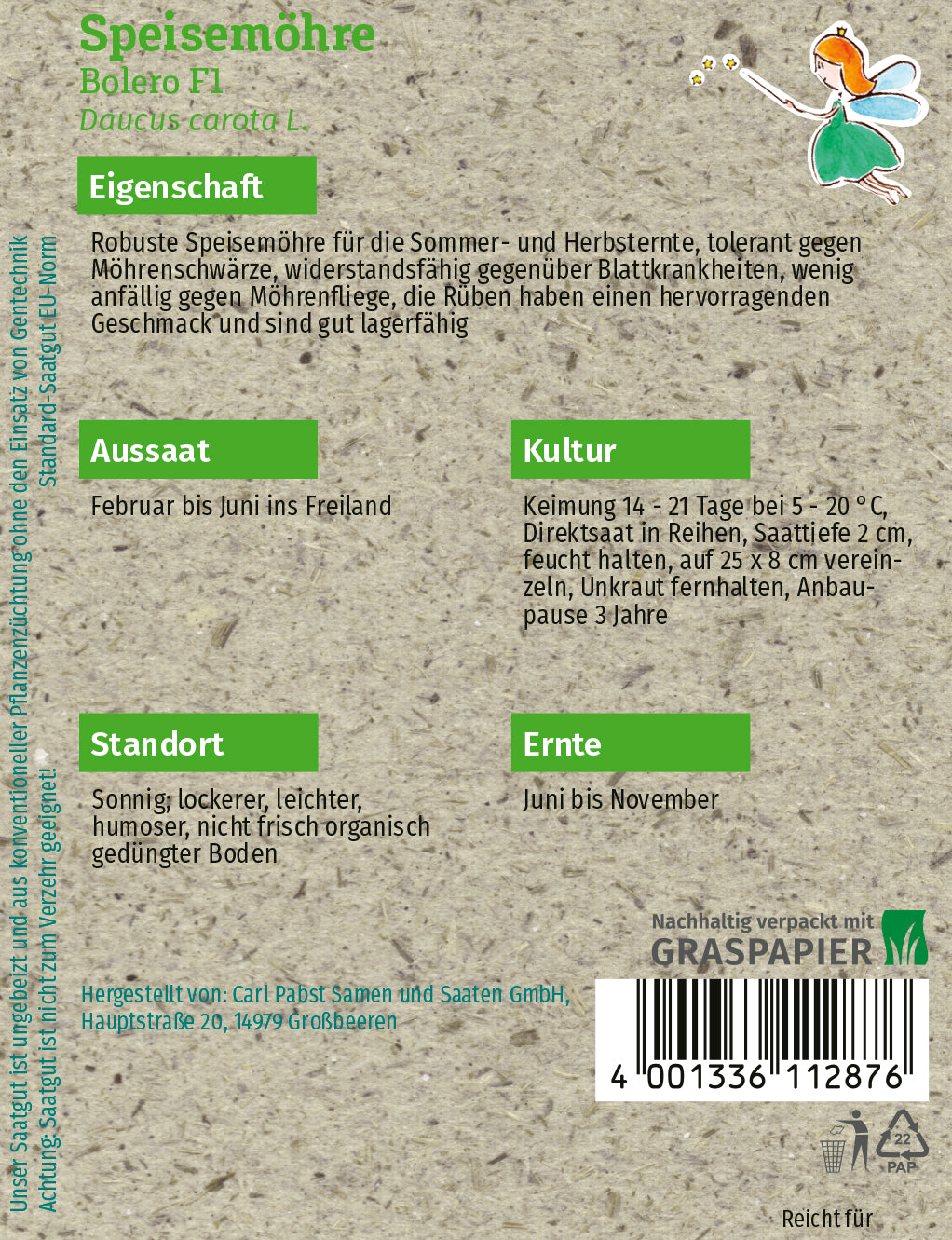 Robuste Speisemöhre für die Sommer- und Herbsternte, tolerant gegen Möhrenschwärze, widerstandsfähig gegenüber Blattkrankheiten, wenig anfällig gegen Möhrenfliege, die Rüben haben einen hervorragenden Geschmack und sind gut lagerfähig.