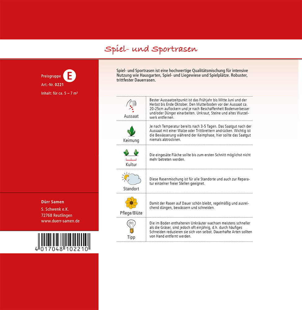 Info: Spiel- und Sportrasen ist eine hochwertige Qualitätsmischung für intensive Nutzung wie Hausgarten, Spiel- und Liegewiese und Spielplätze. Robuster, trittfester Dauerrasen.