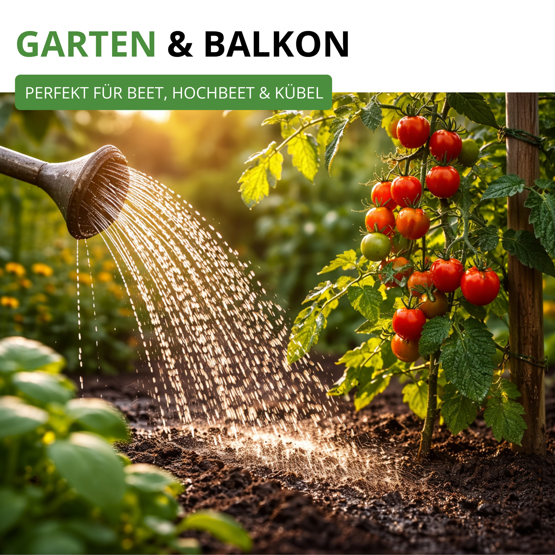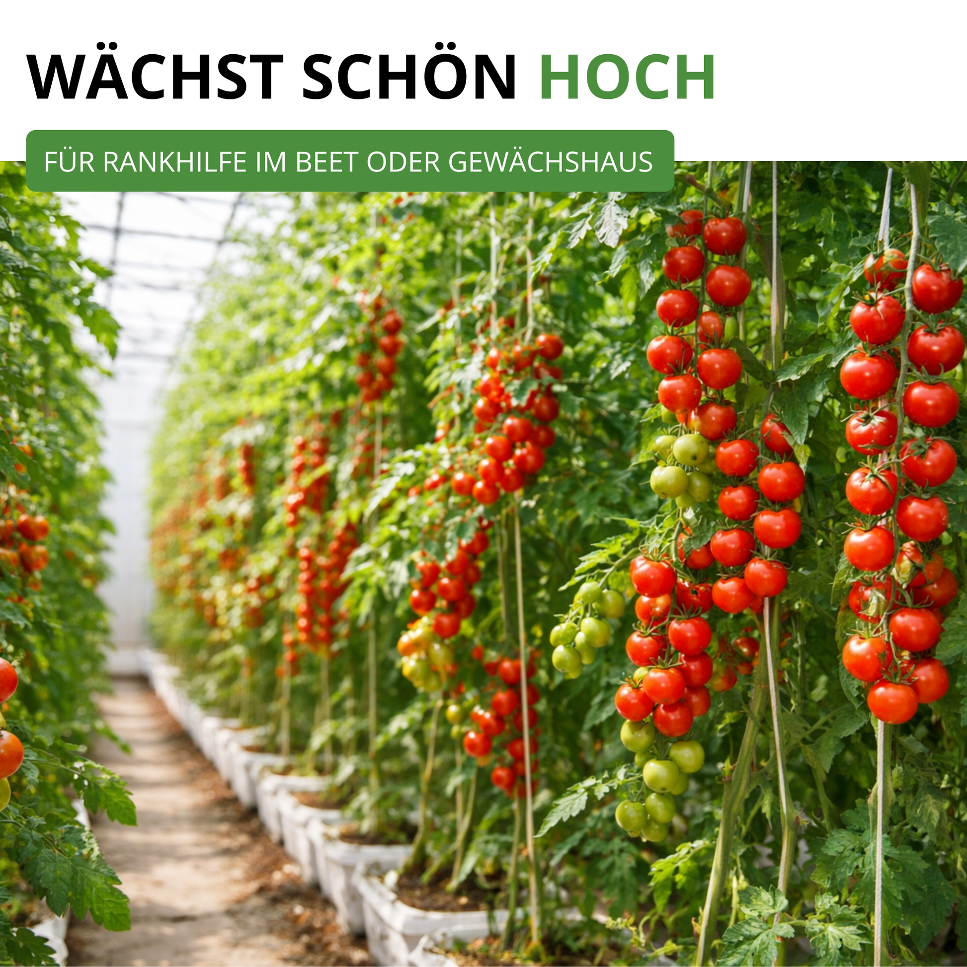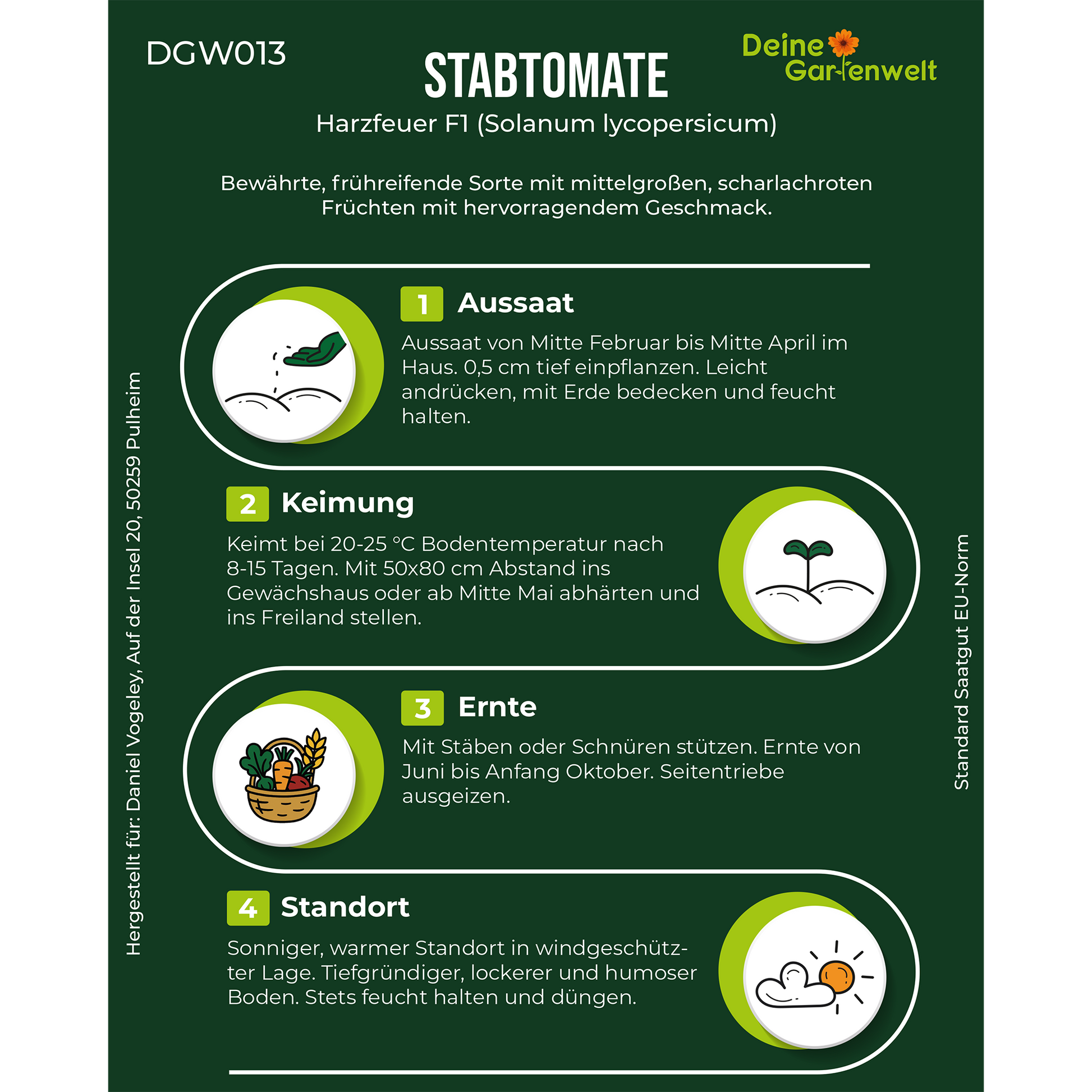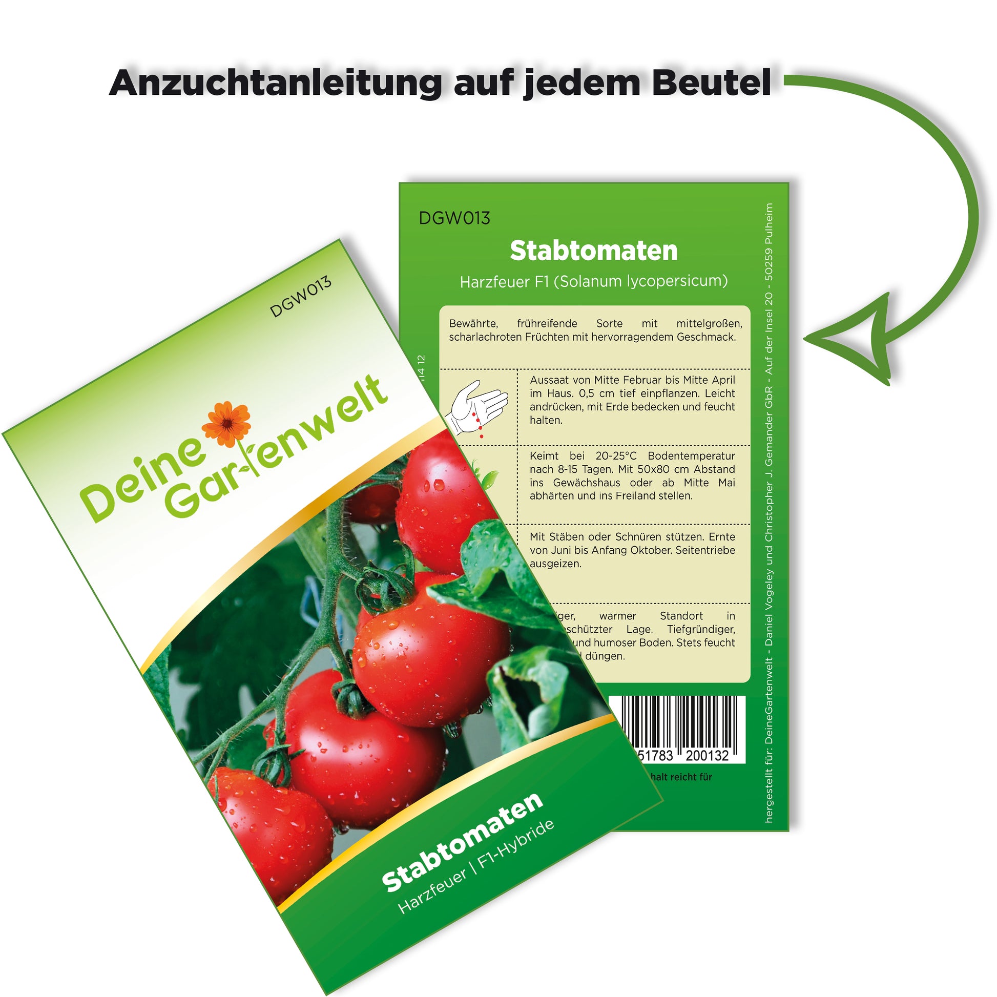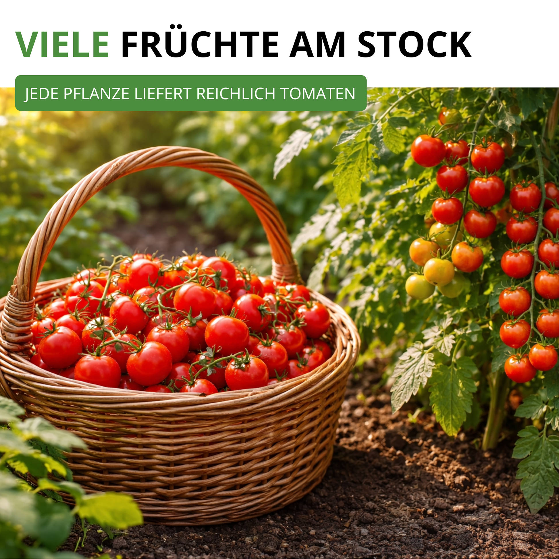 Ernte: Mit Stäben oder Schnüren stützen. Ernte von Juni bis Anfang Oktober. Seitentriebe ausgeizen.