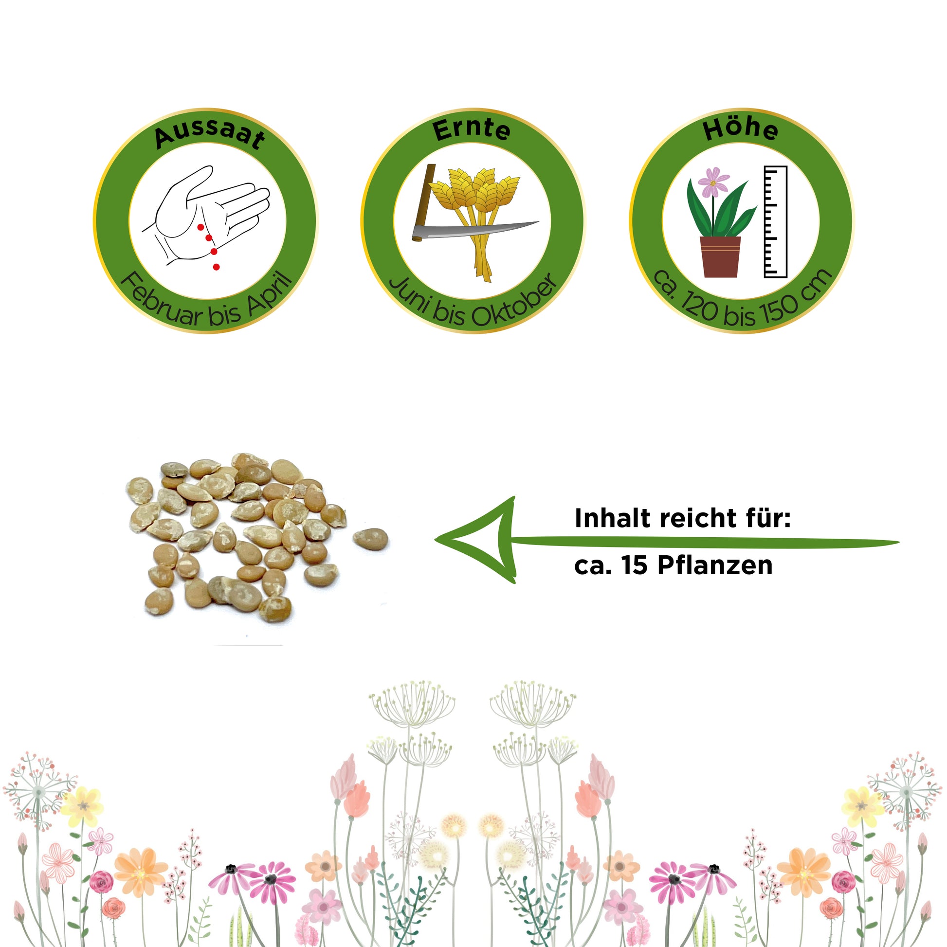 Keimung: Keimt bei 20-25°C Bodentemperatur nach 8-15 Tagen. Mit 50x80 cm Abstand ins Gewächshaus oder ab Mitte Mai abhärten und ins Freiland stellen.
