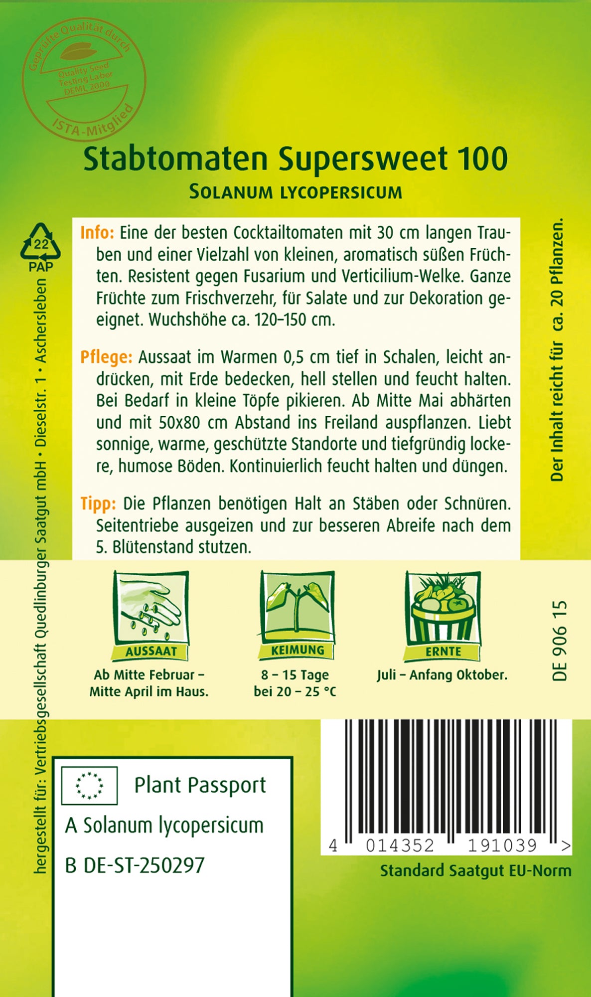 Pflege: Aussaat im Warmen 0,5 cm tief in Schalen, leicht andrücken, mit Erde bedecken, hell stellen und feucht halten. Bei Bedarf in kleine Töpfe ausgeizen und zur besseren Abreife nach dem 5. Blütenstand stützen.