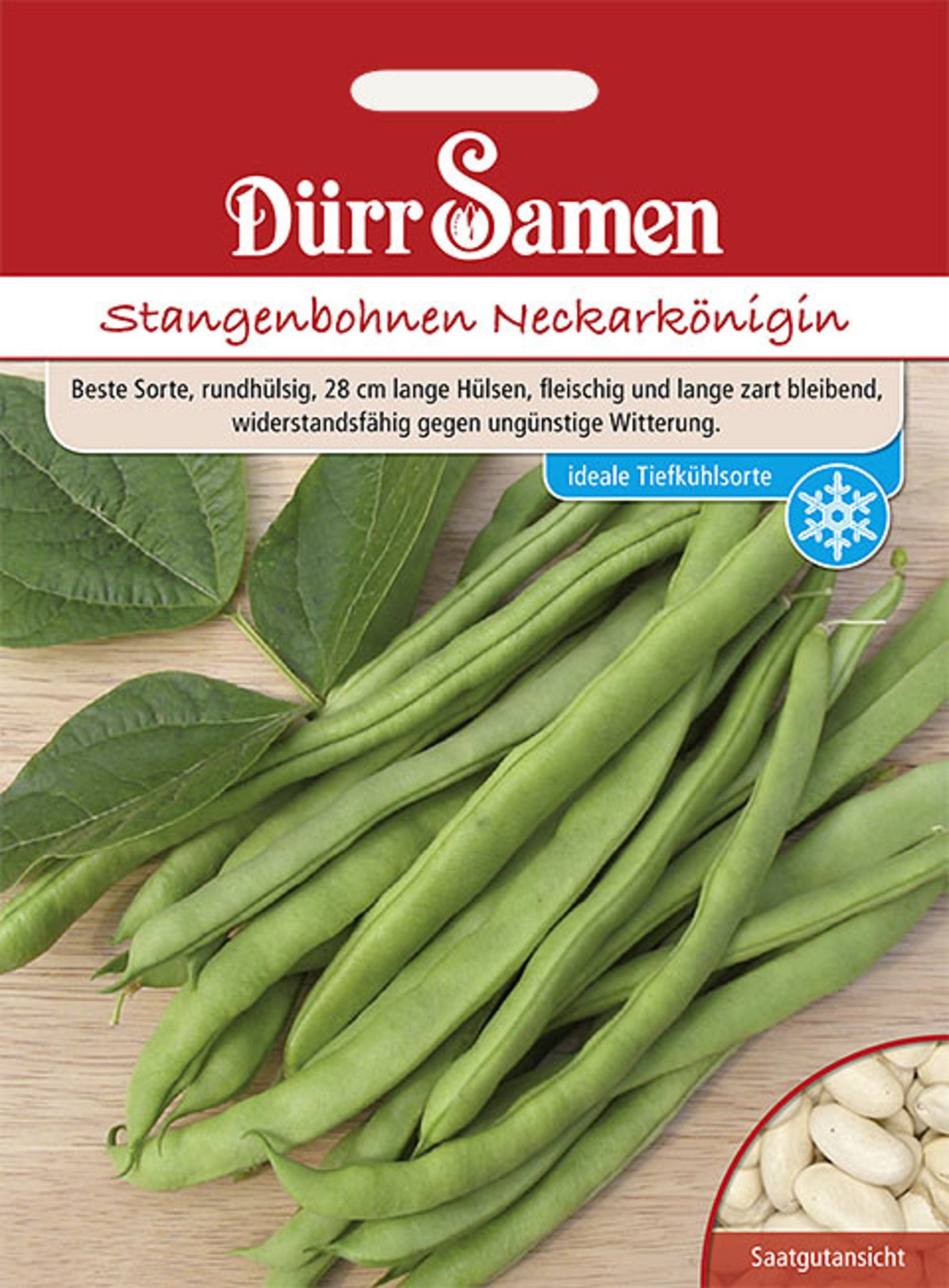 Info: Neckarkönigin ist die bekannteste und bewährteste Stangenbohnensorte. Sie hat ca. 28cm lange fadenlose und sehr zarte Hülsen. Die Pflanzen sind extrem witterungsbeständig und sehr ertragreich.