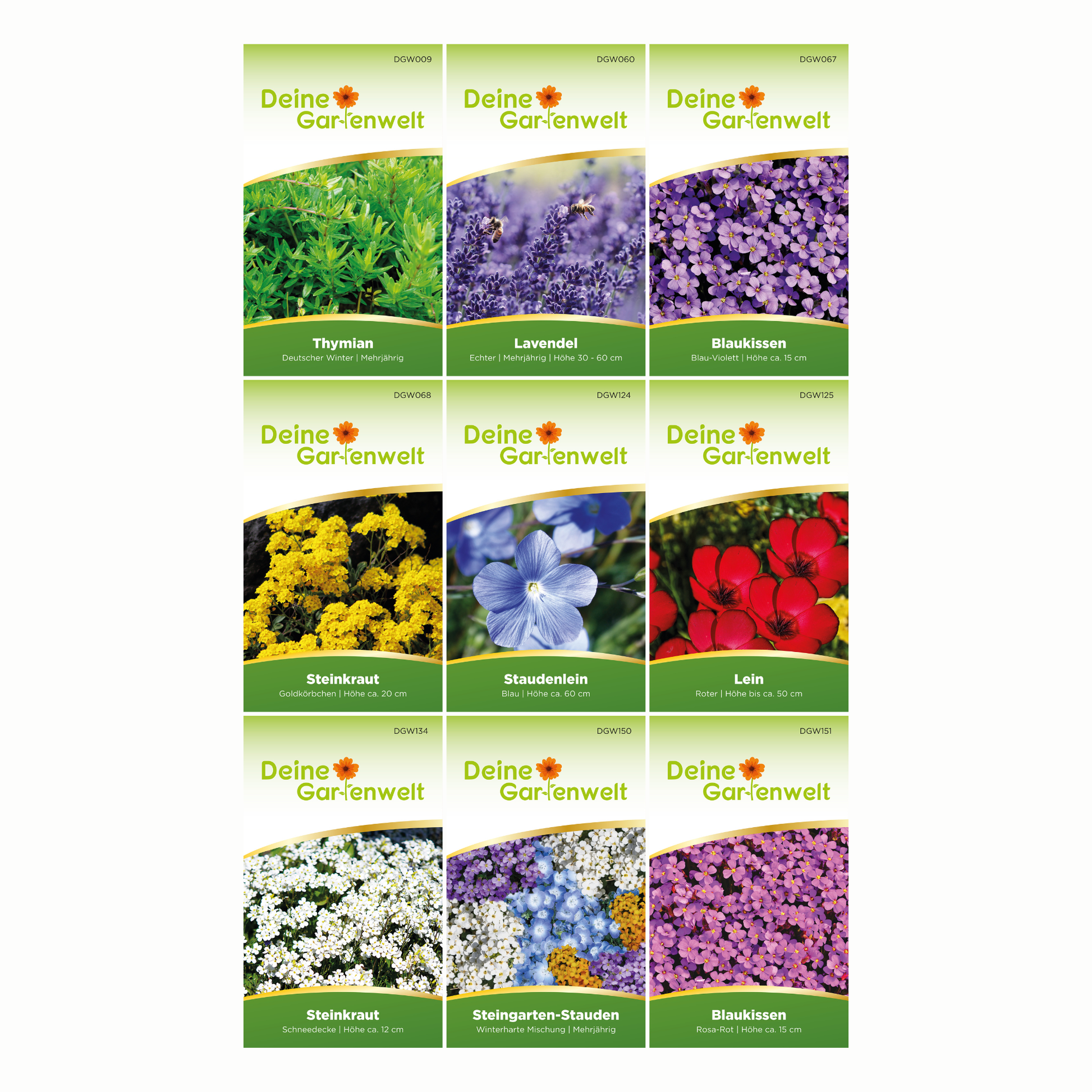 Sortiment aus 9 erlesenen Blumen- und Stauden. Jede Sorte kommt ein einer eigenen Verpackung mit einer Beschreibung und Anleitung.