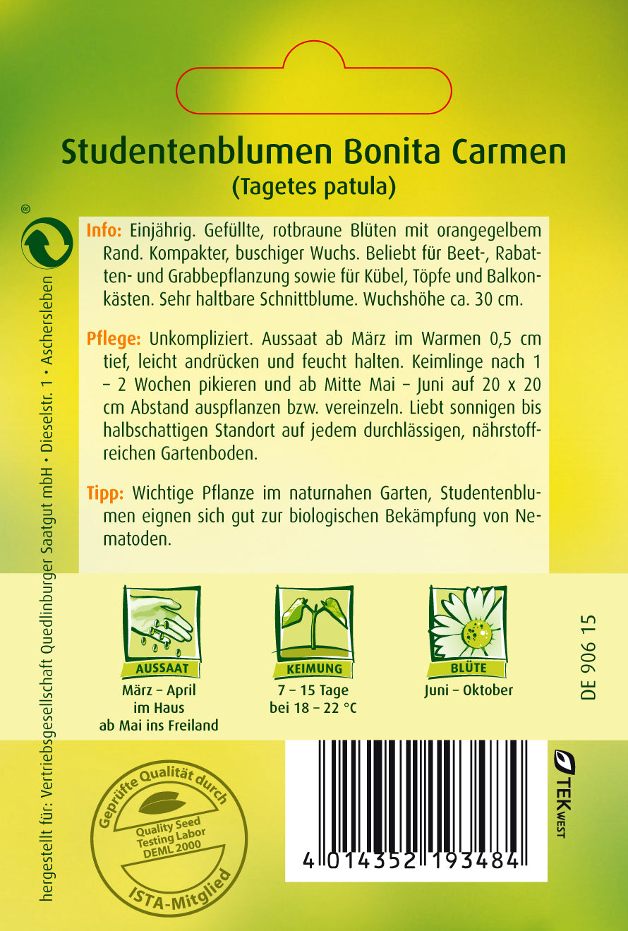 Einjährig. Gefüllte, rotbraune Blüten mit orangegelbem Rand. Kompakter, buschiger Wuchs. Beliebt für Beet-, Rabatten- und Grabbepflanzung sowie für Kübel, Töpfe und Balkonkästen. Sehr haltbare Schnittblume. Wuchshöhe ca. 30 cm.