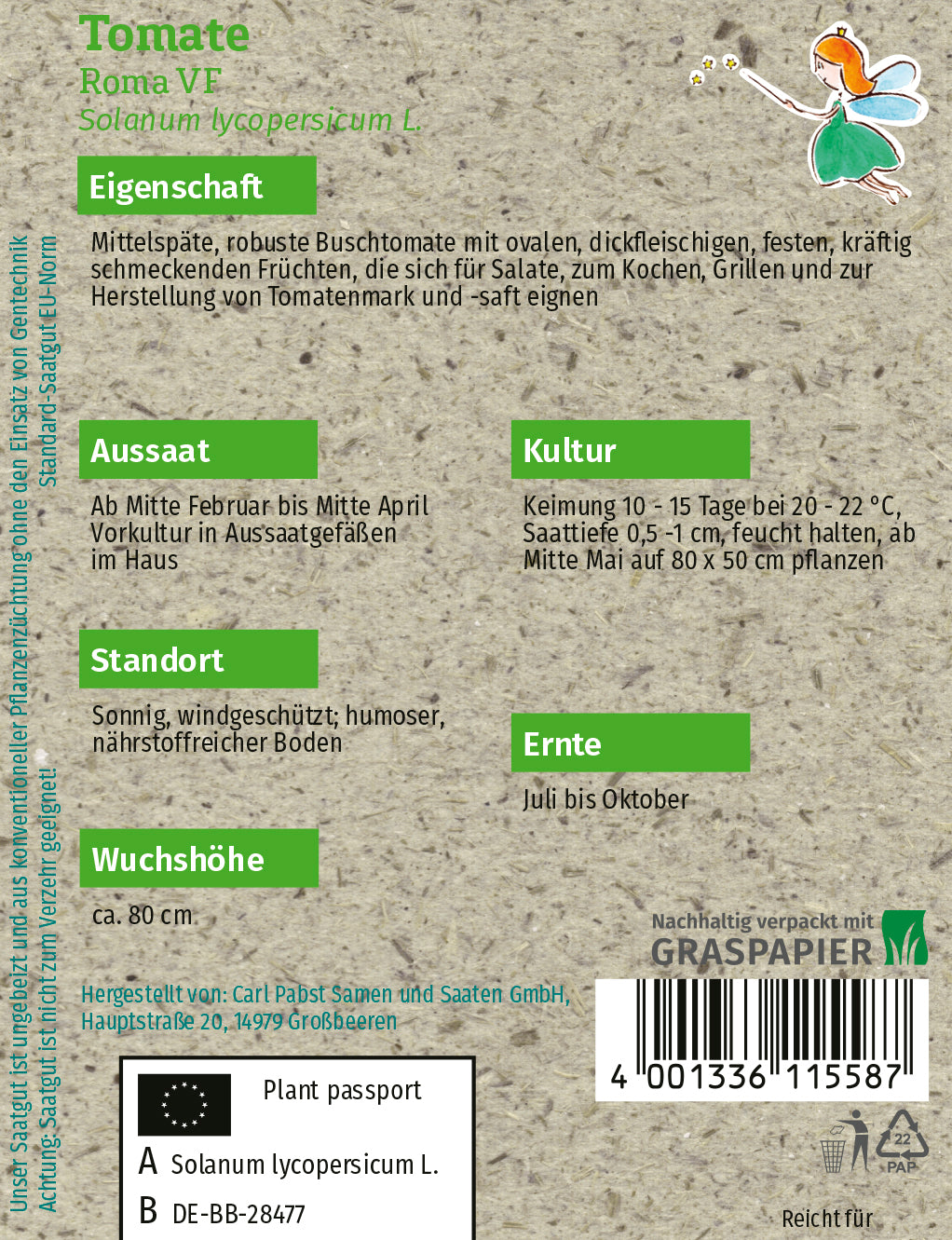 Mittelspäte, robuste Buschtomate mit ovalen, dickfleischigen, festen, kräftig schmeckenden Früchten, die sich für Salate, zum Kochen, Grillen und zur Herstellung von Tomatenmark und -saft eignen.