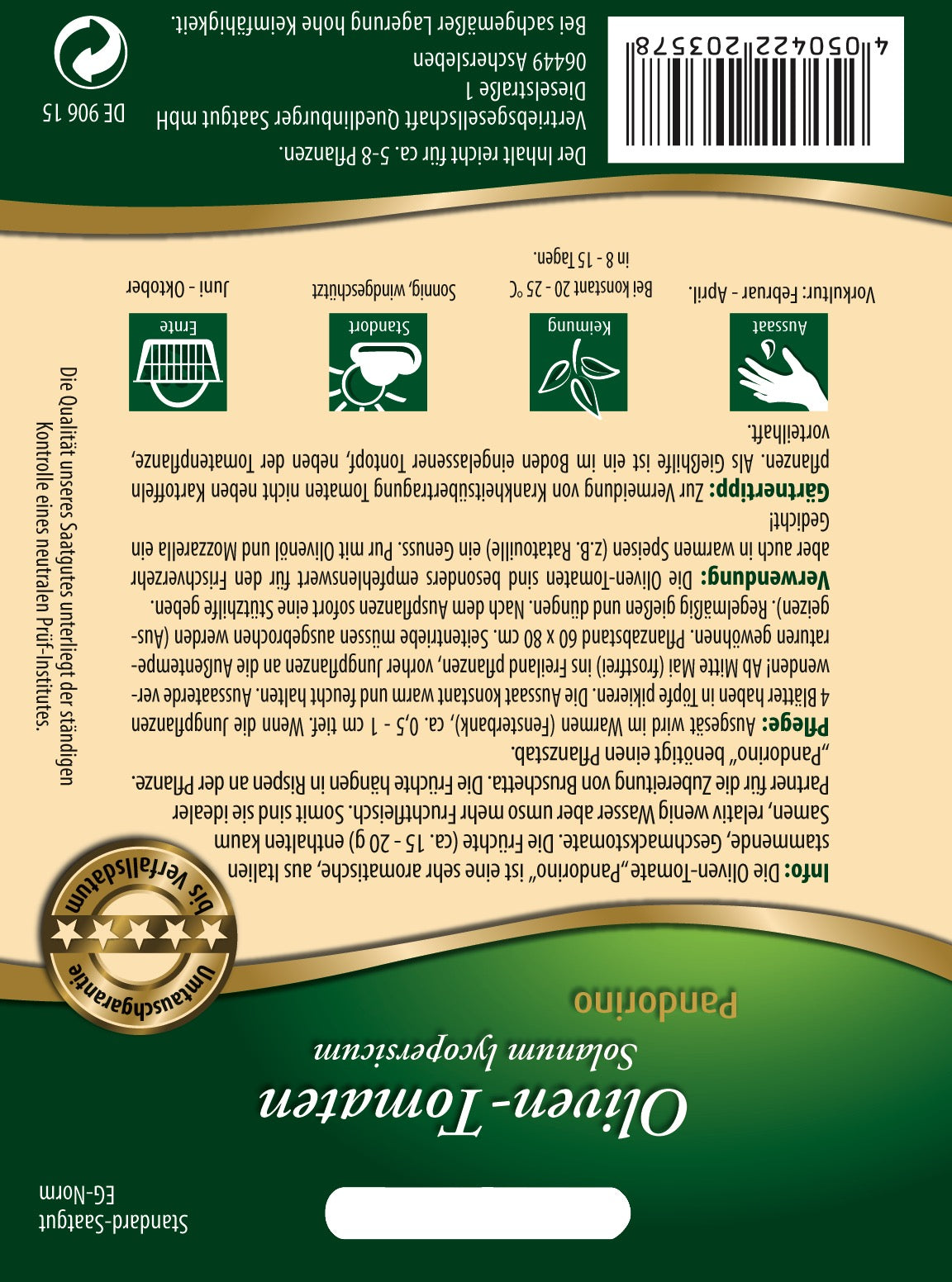 Die Oliventomate 'Pandorino' ist eine sehr aromatische, aus Italien stammende, Geschmackstomate. Die Früchte (ca. 15 - 20 g) enthalten kaum Samen, relativ wenig Wasser aber umso mehr Fruchtfleisch. Somit sind sie idealer Partner für die Zubereitung von Bruschetta. Die Früchte hängen in Rispen an der Pflanze. 'Pandorino' benötigt einen Pflanzstab.