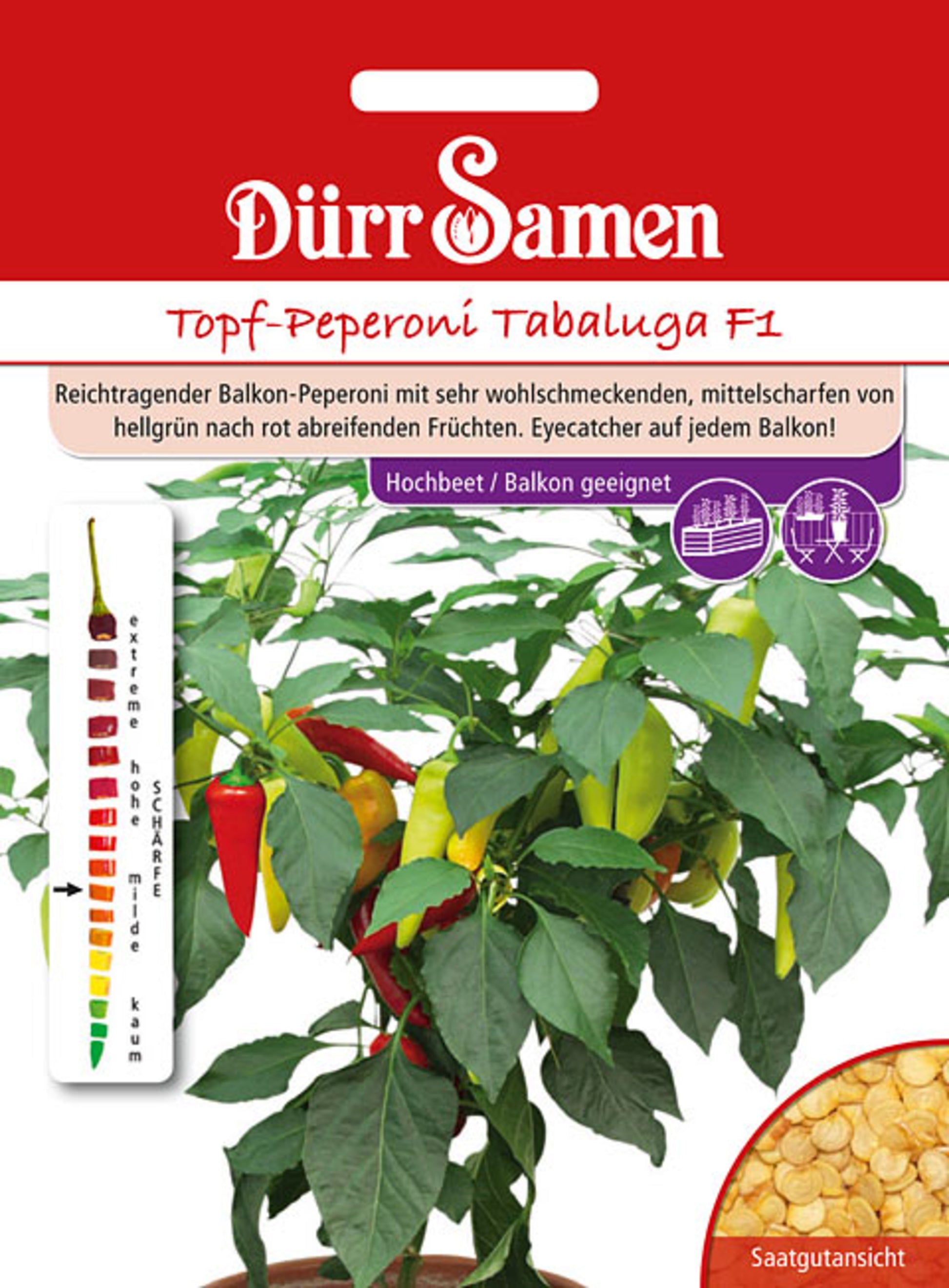 Info: Tabaluga F1 ist ein reichtragender Balkon-Peperoni mit sehr wohlschmeckenden, mittelscharfen von hellgrün nach rot abreifenden Früchten. Eyecatcher auf jedem Balkon!
