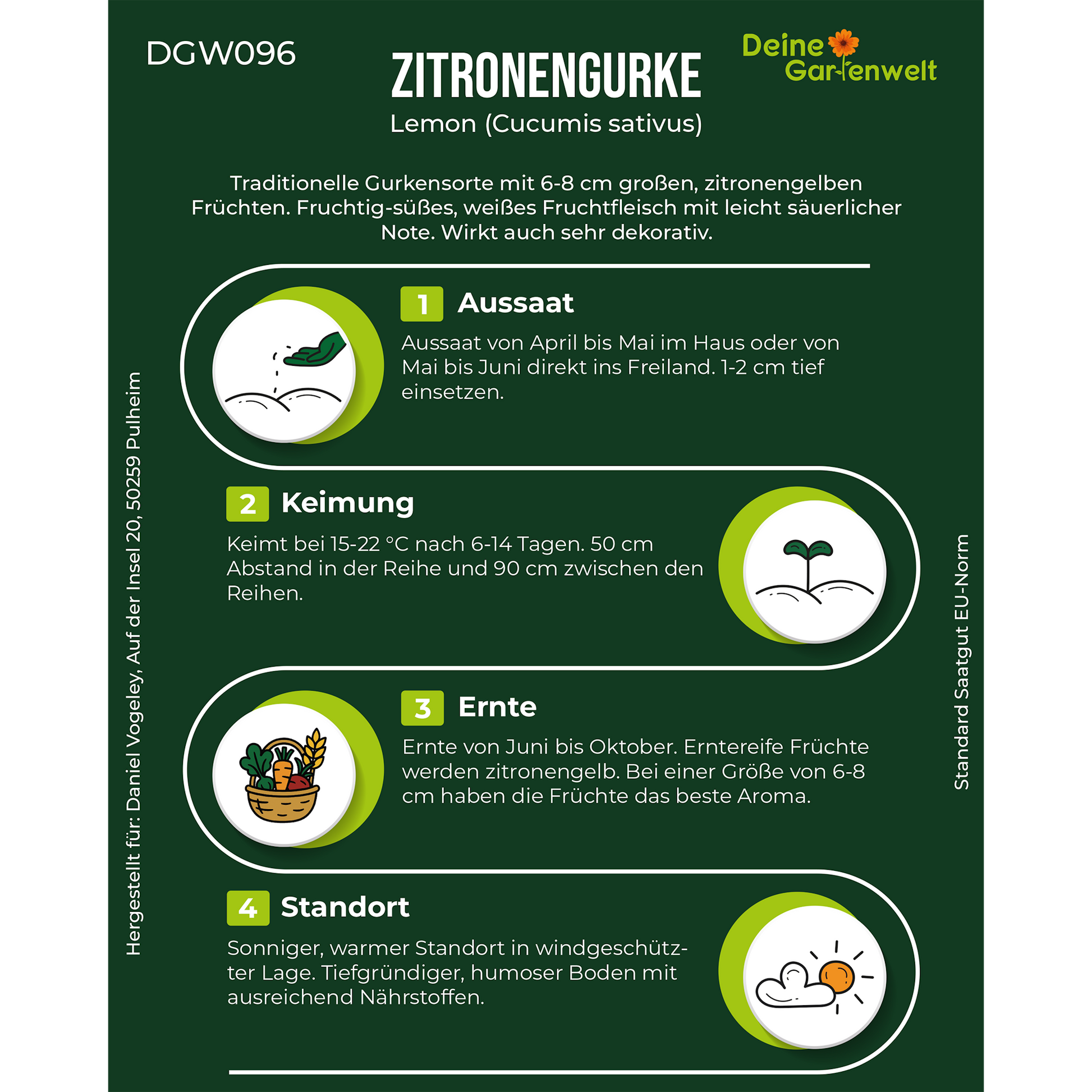Traditionelle Gurkensorte mit 6-8 cm großen, zitronengelben Früchten. Fruchtig-süßes, weißes Fruchtfleisch mit leicht säuerlicher Note. Wirkt auch sehr dekorativ.