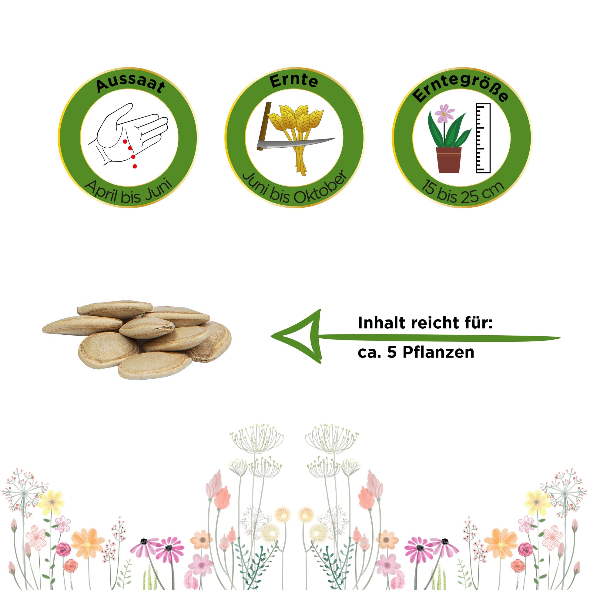 Keimung: Keimt bei 20-22°C Bodentemperatur nach 8-14 Tagen. Ab Ende Mai auf 80x80 cm vereinzeln.