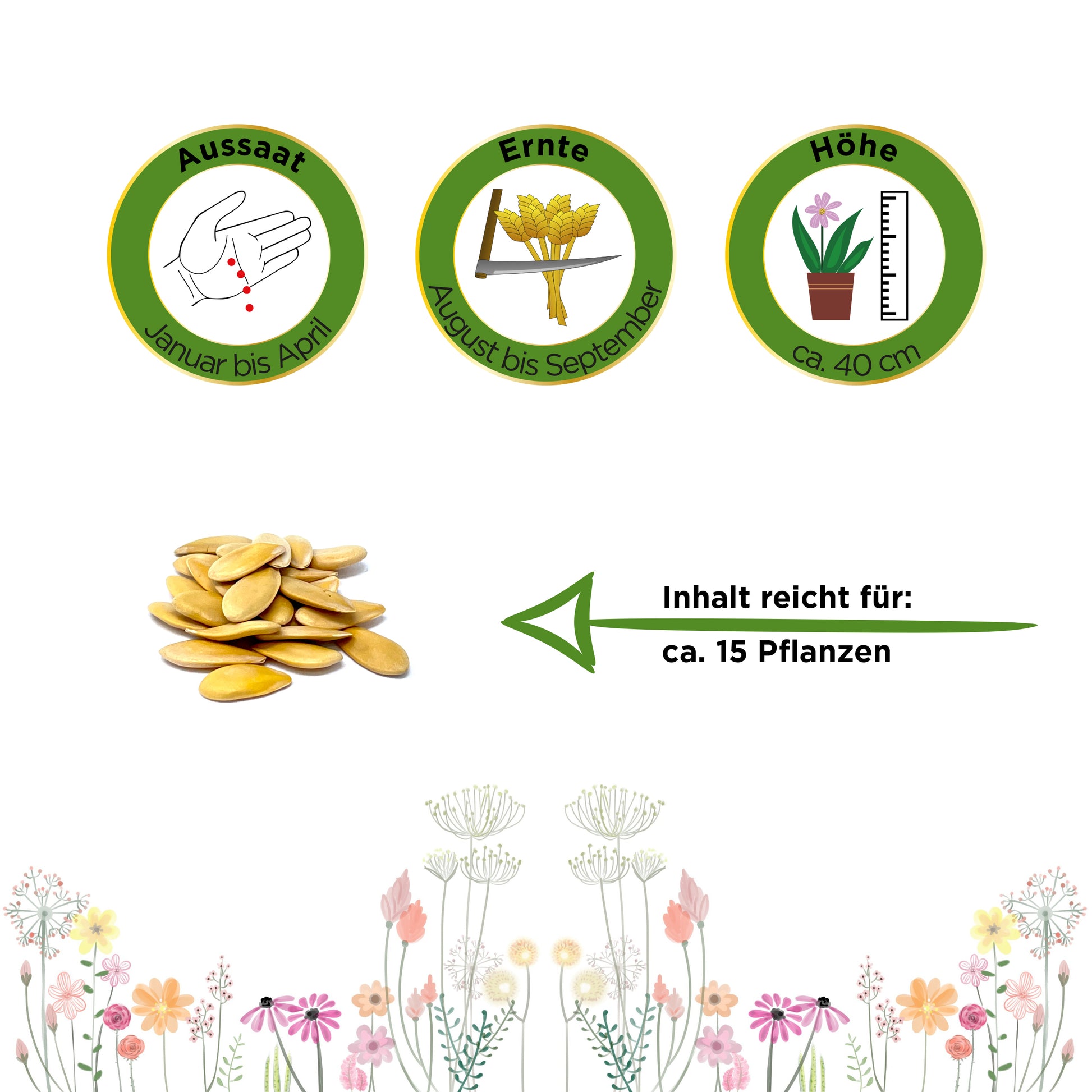 Keimung: Keimt bei 20-30°C nach 15-20 Tagen. Ab Mitte März ins Frühbeet oder ab Ende Mai abhärten und frostfrei ins Freiland setzen. Abstand 150x80 cm.