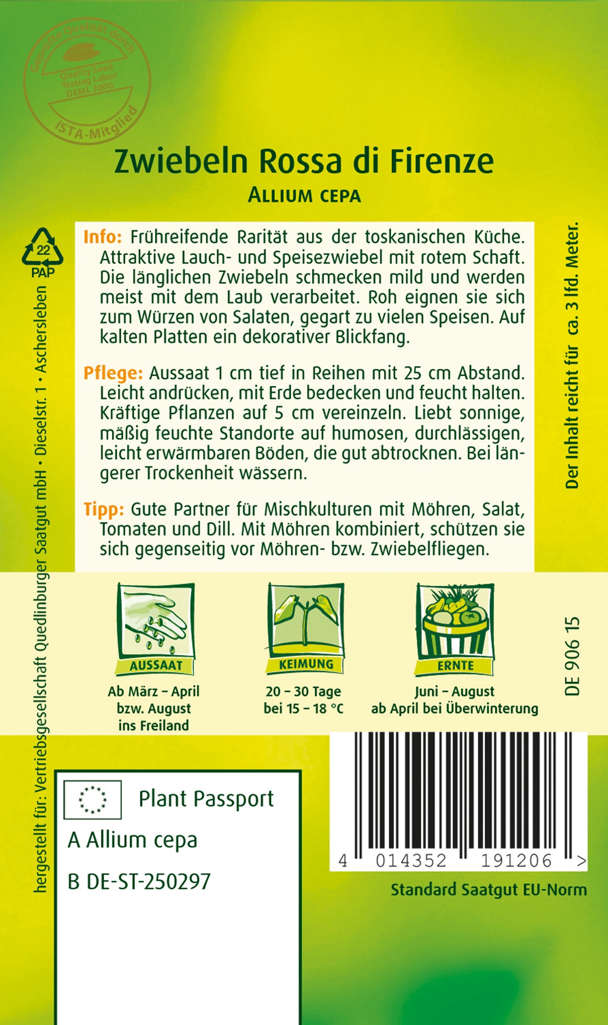 Frühreifende Rarität aus der toskanischen Küche. Attraktive Lauch - und Speisezwiebel mit rotem Schaft. Die länglichen Zwiebeln schmecken mild und werden meist mit dem Laub verarbeitet. Roh eignen sie sich zum Würzen von Salaten, gegart zu vielen Speisen. Auf kalten Platten ein dekorativer Blickfang.